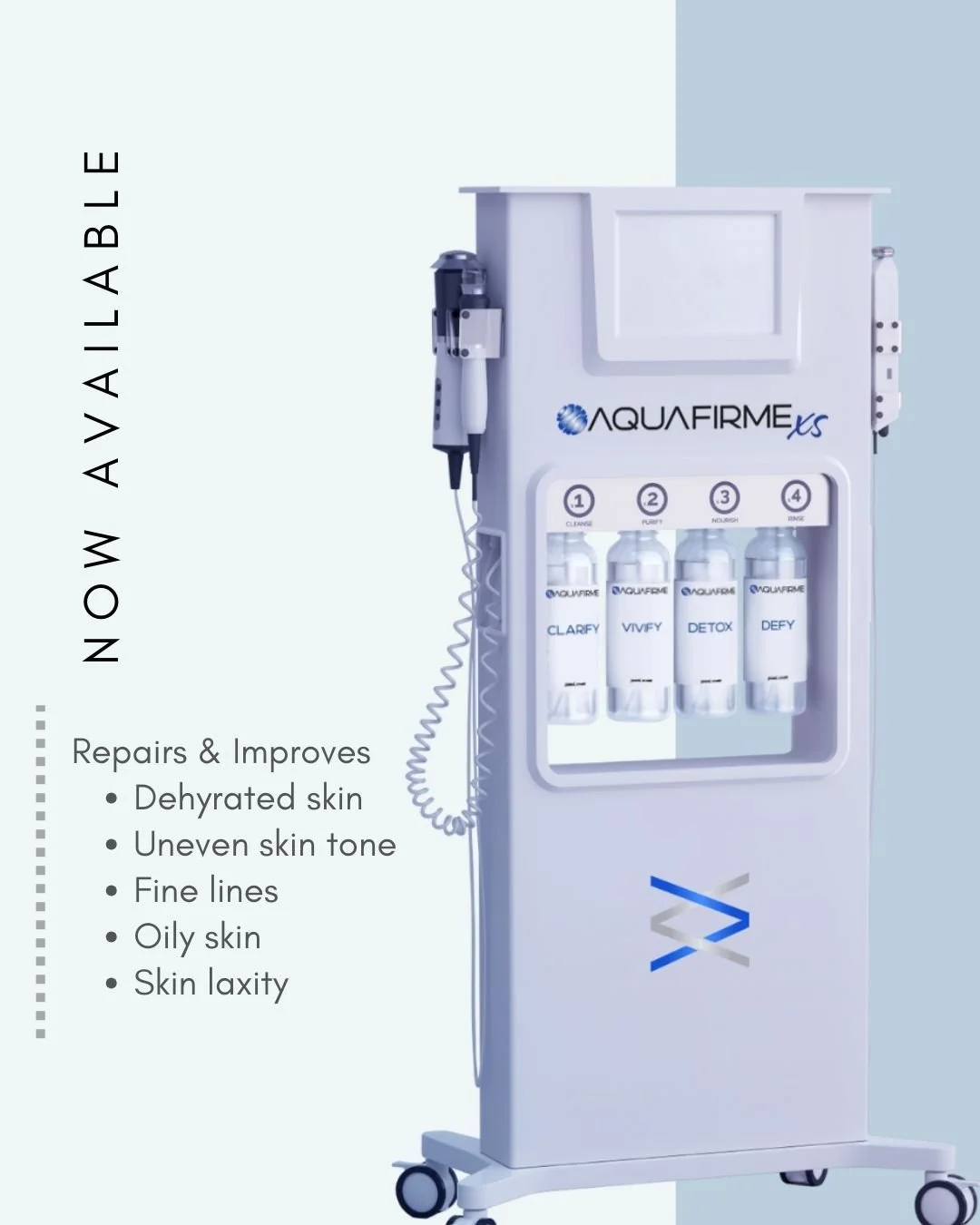 AquaFirme is an advanced, multi-step, noninvasive skin treatment system that uses two different technologies, namely EVO and EXO2. EVO delivers nourishing ingredients deep into the skin to give it a healthy glow. EXO2 oxygenates and hydrates the skin.